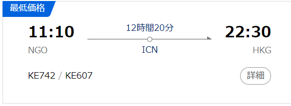 まず方法1を調べると、大韓航空の韓国経由の乗継便がありました。