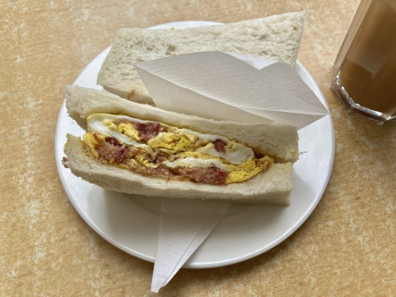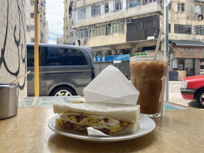 今回は咸牛肉蛋三文治と凍奶茶を注文しました。